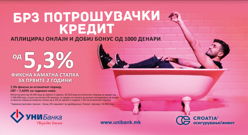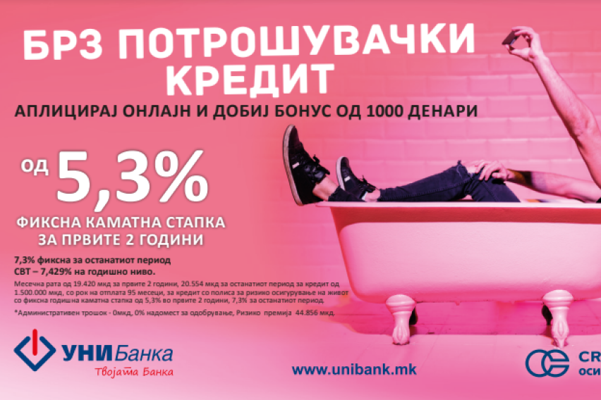 Токму тоа го овозможува УНИБанка АД Скопје со својот потрошувачки кредит до 1.500.000 денари, кој сега е со намалена каматна стапка – фиксна за цел период и тоа од 5,3% за првите две години, и од 7,30% за останатиот период. Потрошувачкиот кредит е со вклучена полиса за ризико осигурување на живот, каде е вклучено и осигурително покритие од Ковид-19 за заштита на семејството и посигурна иднина.