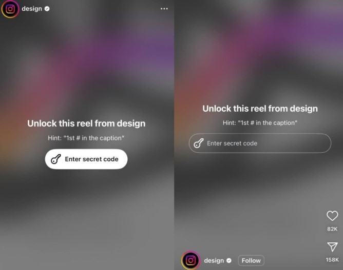 На пример, креаторот може да заклучи еден рил со навестување „мојата омилена храна“, а неговите следбеници веројатно ќе го знаат одговорот. Социјалната мрежа во сопственост на Мета ја тестира функцијата на својот профил „Design“ и сподели заклучен рил кој бара од корисниците да внесат „таен“ код врз основа на навестувањето кое гласи „first # in the caption“.