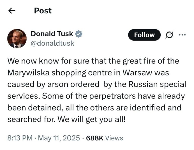 Вчера, премиерот Доналд Туск изјави дека Полска „со сигурност“ знаела дека руските тајни служби стојат зад големиот пожар на улицата Меривилска во главниот град.
