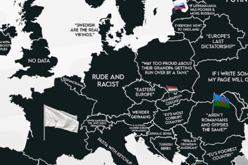 На картата со наслов „Како да ги навредите Европејците со една реченица“, секоја земја добила свој „опис“ заснован на стереотипи, историски несогласувања и национални чувствителности.