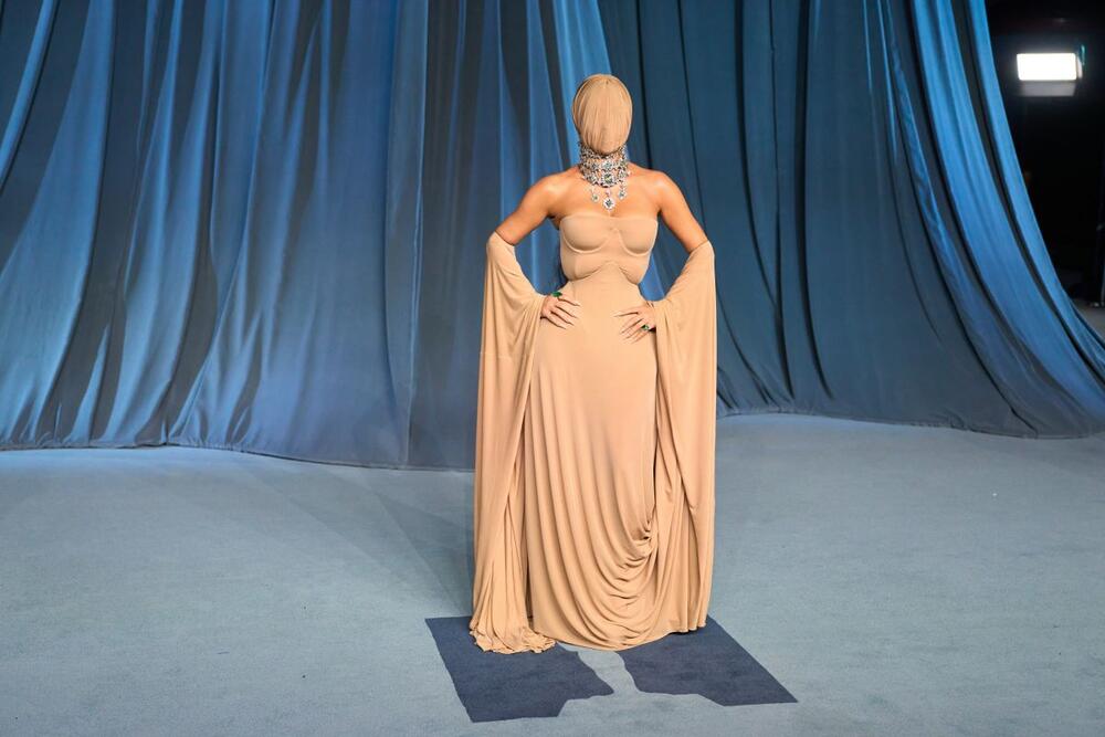 Ким носела „nude“ фустан од колекцијата есен 2025 година, баш на начинот на којшто тој бил претставен на ревијата во Париз – со парче ткаенина со боја на песок на главата.
