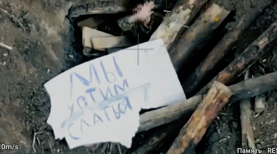 Двајца руски војници излегле од засолништето, невооружени и без панцири, секој држејќи една страна од картонот. Тие го следеле дронот по селски пат до украинските сили што ги заробиле.