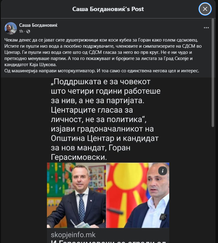 „Чекам денес да се јават сите душегрижници кои коси кубеа за Горан како голем сдсмовец. Истите ги пушти низ вода а посебно подржувачите, членовите и симпатизерите на СДСМ во Центар. Ги пушти низ вода сите што од СДСМ гласаа за него во прв круг. Не е ни чудо и претходно менуваше партии. А тоа го покажуваат и бројките за листата за Град Скопје и кандидатот Каја Шукова.