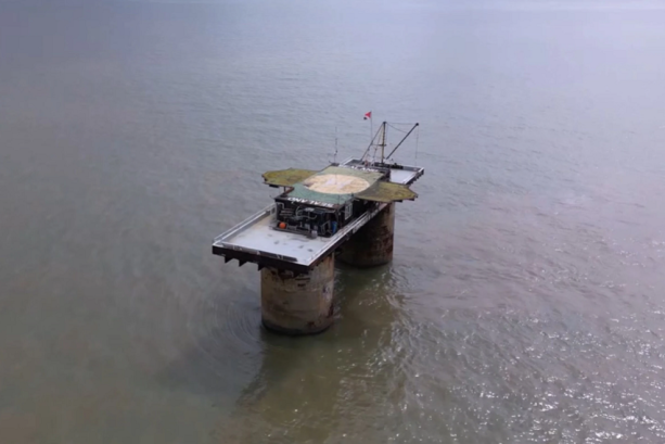 Колор-блок тоалетата има горен дел во комбинација од темнозелена и светлорозова боја, со висок, затворен околувратник, а здолништето е спој од црна и црно-бела карирана ткаенина. Целиот фустан изгледа како составен од низа сошиени ленти што дијагонално паѓаат по телото.