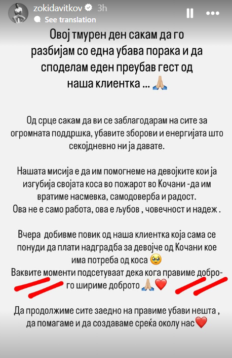 Фризерот и стилист Зоки Давитков на своите социјални мрежи сподели приказна која ја враќа вербата во луѓето - негова клиентка се понудила да плати надградба на коса за девојче од Кочани кое ја изгубило својата коса во страшниот пожар.