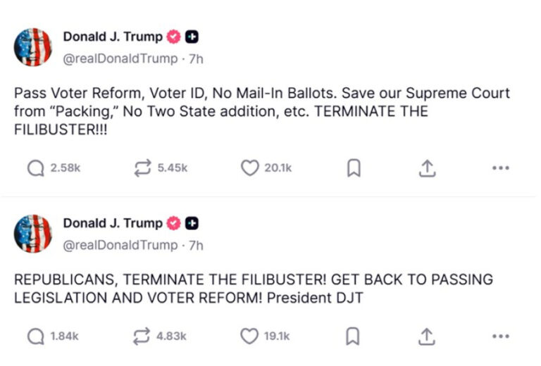 „Да се ​​усвои реформа на гласањето, лични карти на гласачите, без гласање по пошта. Да се ​​спаси нашиот Врховен суд од „пакување“, без додавање на две држави, итн. „Укинете го ФИЛИБАСТЕРОТ!!!“ напиша Трамп во објава на Truth Social.