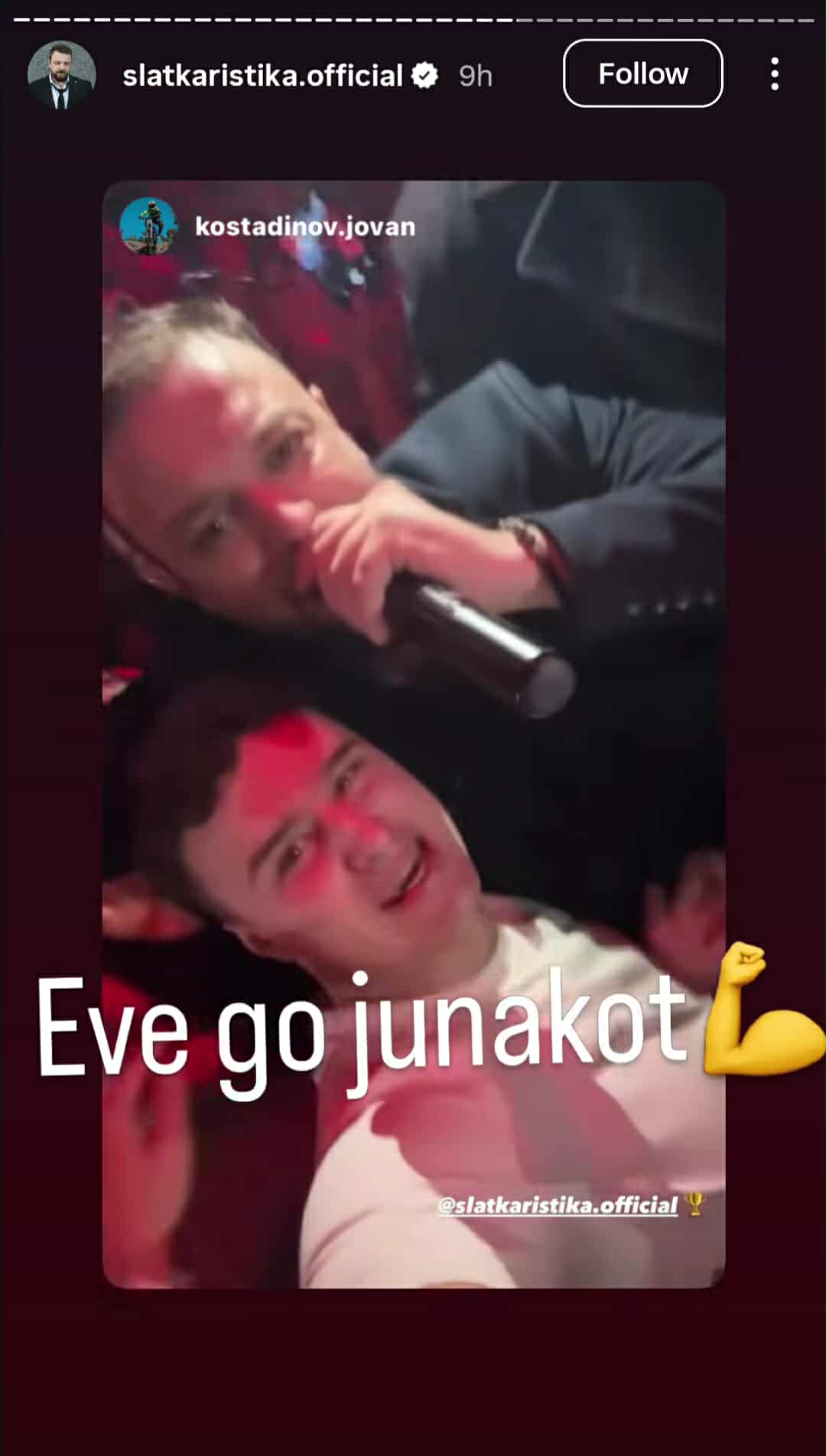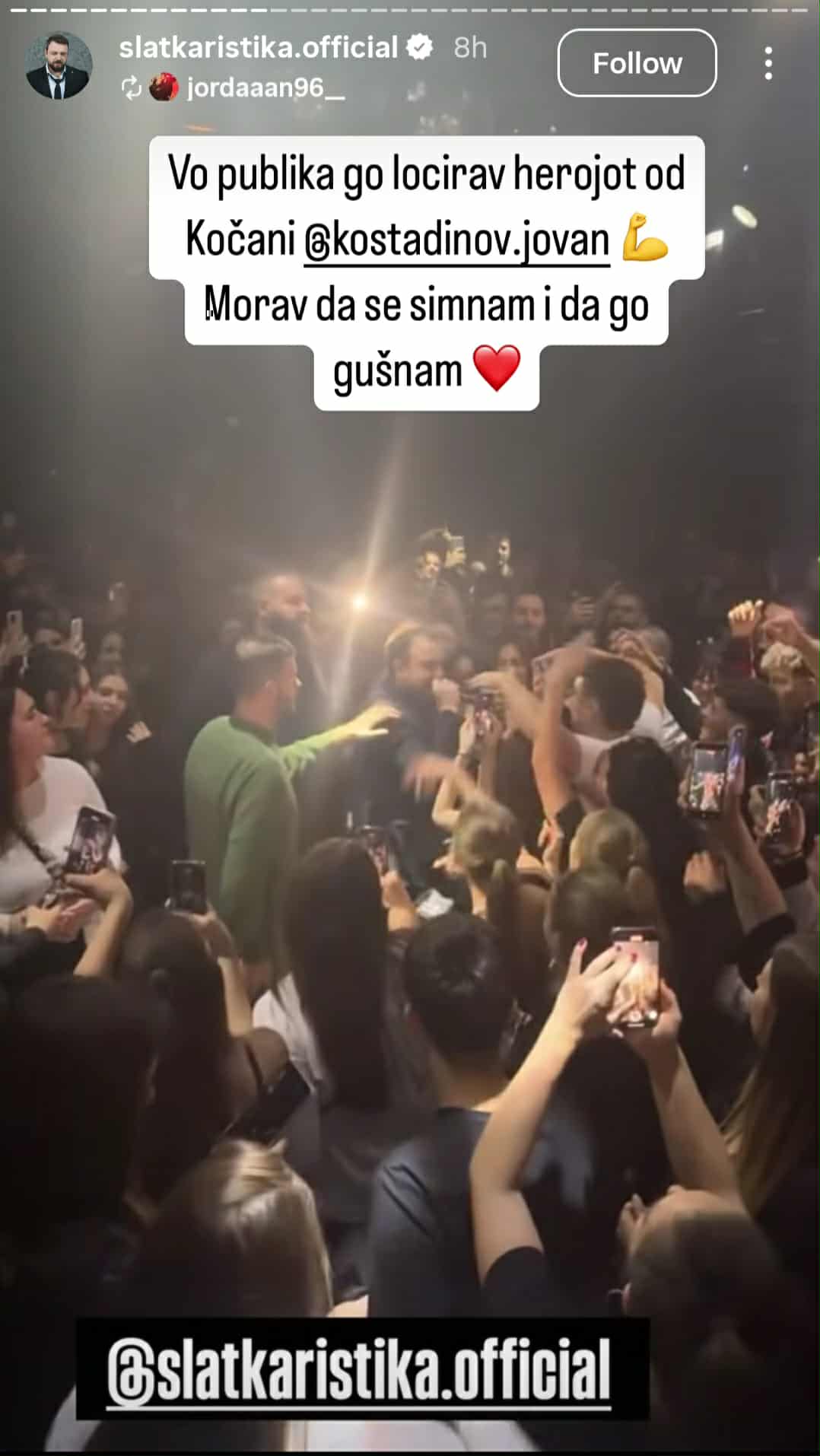 „Во публика го лоцирав херојот од Кочани. Морав да се симнам и да го гушнам“, напиша Слаткар на социјалната мрежа Инстаграм каде објави фотографија од него и Јован.