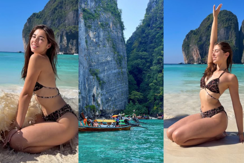 На фотографиите таа позира во костим за капење на спектакуларна плажа опкружена со високи варовнички карпи - типичен пејзаж за островите Пи Пи, една од најпознатите тајландски дестинации. Синото море, силните тропски бои и живописната природа создаваат вистинско „рајско“ чувство.