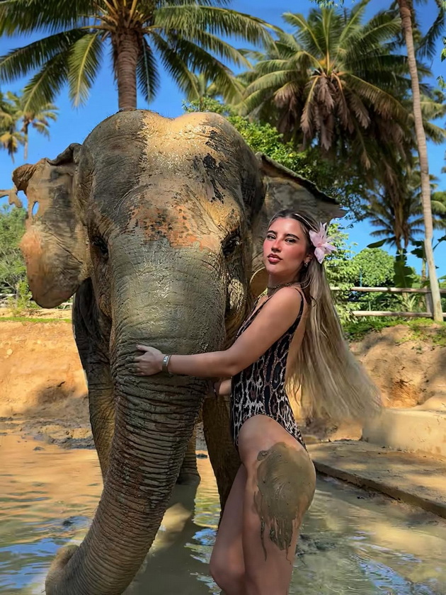 Најголем интерес сепак привлече моментот кога инфлуенсерката позираше во кал, прегрнувајќи слон во засолниште за животни. Видно разнежнета, таа напиша дека слоновите ѝ станале омилен дел од патувањето, а во шега додаде дека би сакала „да си понесе една слоница дома“.