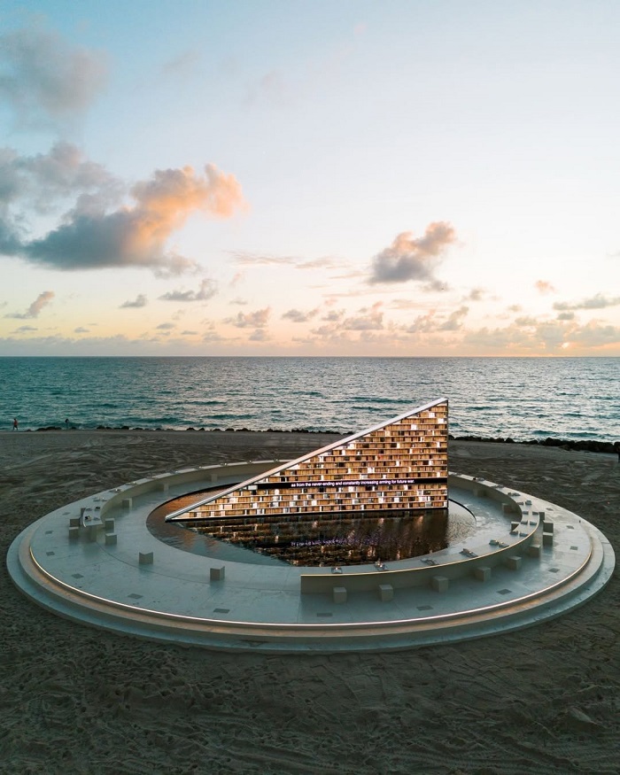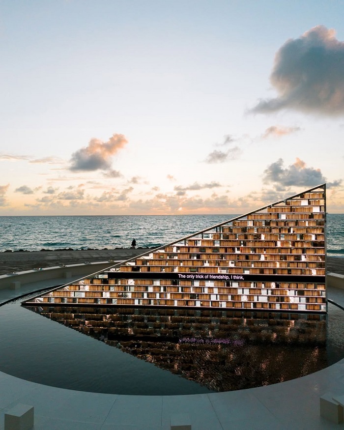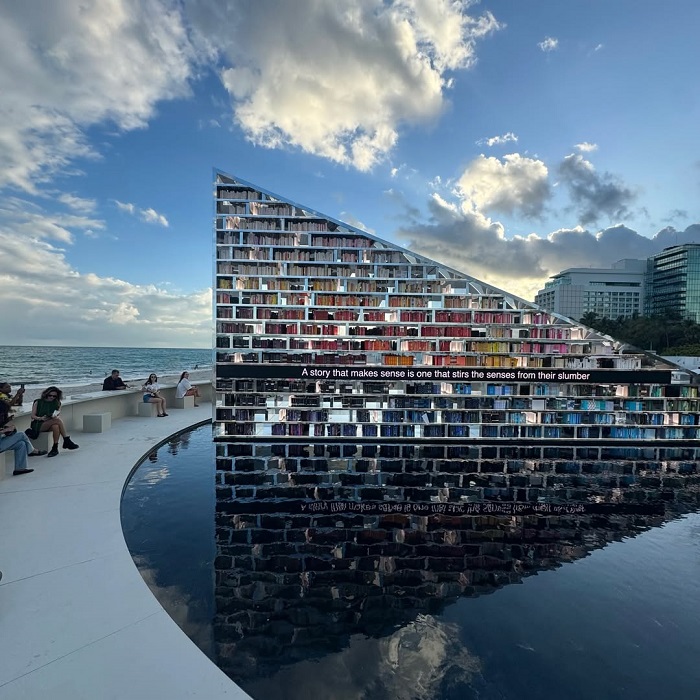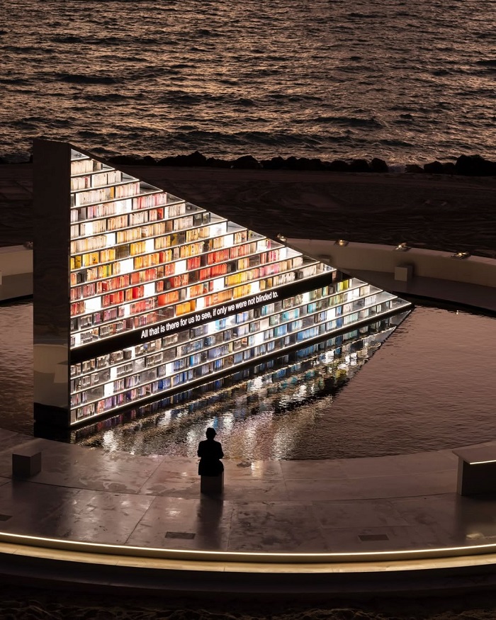 Инсталацијата, поставена на крајбрежјето во рамките на „Faena District“, го претвора просторот во интимен, блескав амфитеатар посветен на книгите, звукот и споделеното читање, пишува „Њујорк тајмс“.