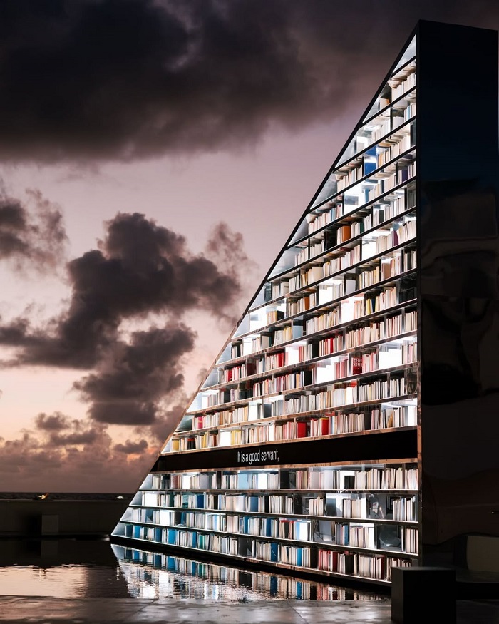 Британската уметница и сценографка Ес Девлин, позната по впечатливите просторни инсталации кои ги бришат границите меѓу уметноста, архитектурата и перформансот, ја претстави својата најнова работа – „Library of Us“, шест метри висока триаголна ротирачка полица за книги што се издига од надреален воден базен.