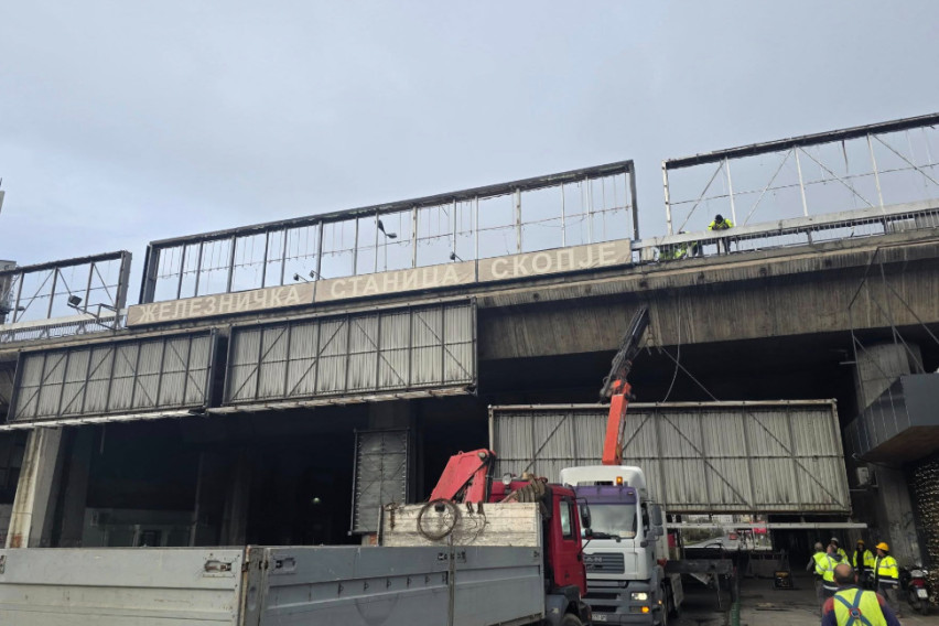 [ФОТО/ВИДЕО] Отстранет првиот билборд од Железничката станица Скопје: „Она што Станицата изгледа како пит-стоп на Формула 1 веќе нема да биде така“
