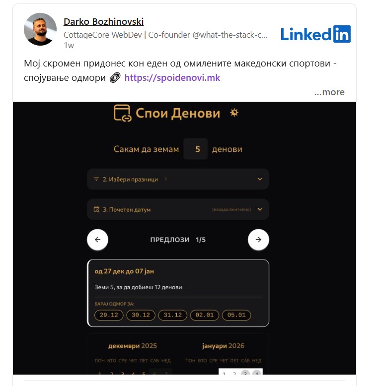 Македонецот Дарко Божиновски ја претстави новата веб-апликација spoidenovi.mk, која на корисниците им помага полесно да го испланираат својот одмор. Со само неколку кликови, апликацијата пресметува кога е најповолно да земете слободни денови од работа за да добиете подолг одмор или продолжен викенд.