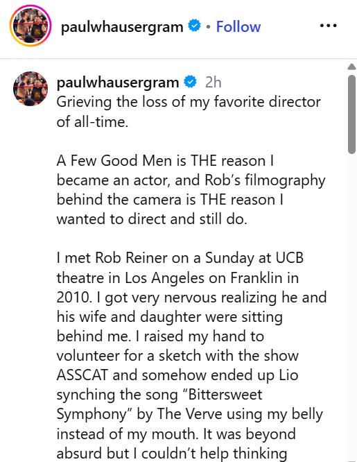 Актерот Пол Волтер Хаузер се присетил на средбата со режисерот во долга објава. „Неколку добри луѓе се ПРИЧИНАТА поради која станав актер, а филмографијата на Роб зад камерата е ПРИЧИНАТА поради која сакав да режирам и сè уште сакам“, меѓудругото напишал тој.