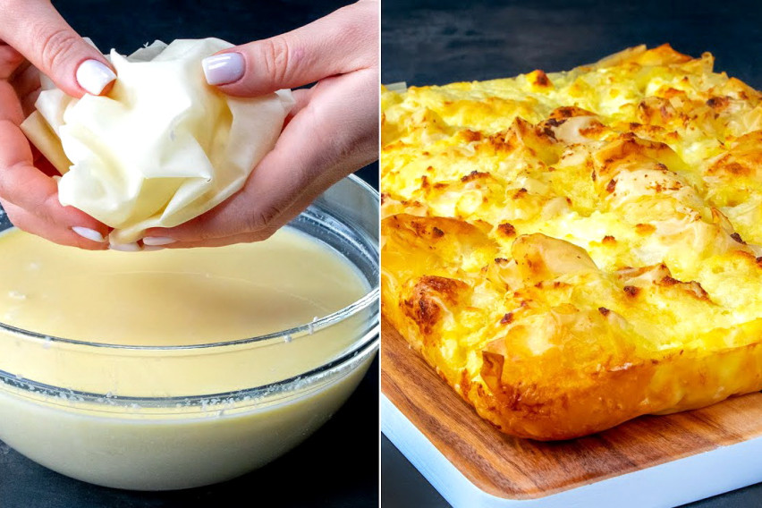 Здробете го сирењето, па во него додадете го јогуртот, јајцата, прашокот за печиво и млекото. Сѐ добро измешајте и ставете ја смесата над корите. Затворете со кори и повторно прелијте со смесата.