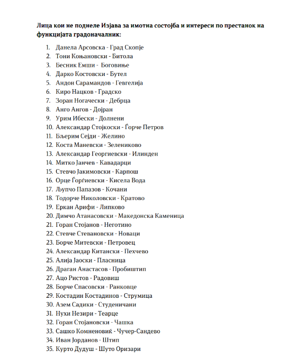– 35 лица по престанок на функцијата – градоначалник, немаат поднесено изјава за имотна состојба и интереси и