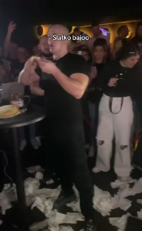 Раперот, чие вистинско име е Драгомир Деспиќ е познат по своите бизарни настапи. Освен што глумел фризер, тој донел и палачинки со нутела на сцената во клубот во Нашице.