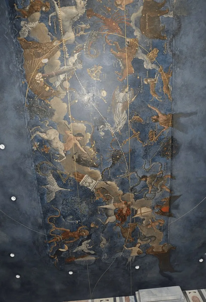 Таванот бил рачно насликан и прикажува разни животни, како и соѕвездија на облачно небо, заедно со знаците на зодијакот.