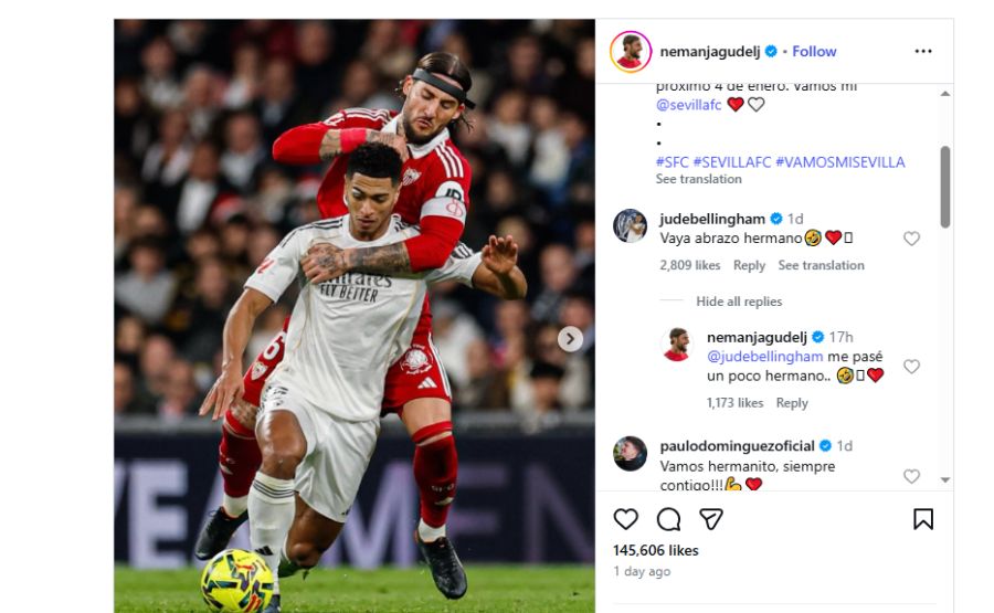 Србинот избра неколку слики за да ја комплетира својата објава, со тоа што една посебно му го задржа фокусот и на Џуд Белингам.