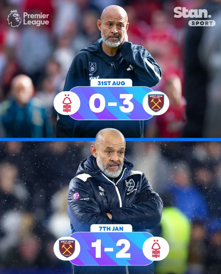 Половина година подоцна, двата тима повторно се сретнаа. Сега Нуно Еспирито Санто е тренер на Вест Хем кој загуби од Нотингем Форест со резултат 2:1.