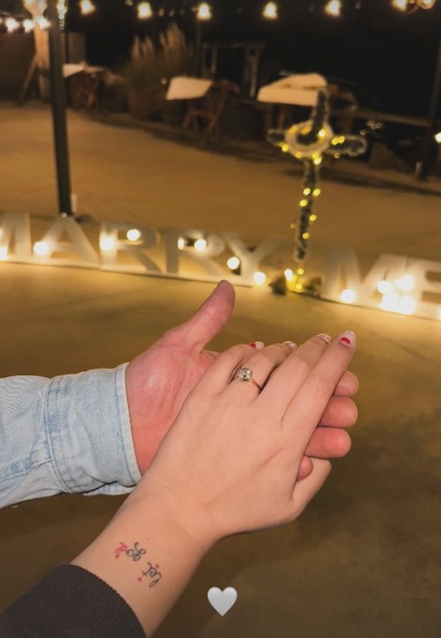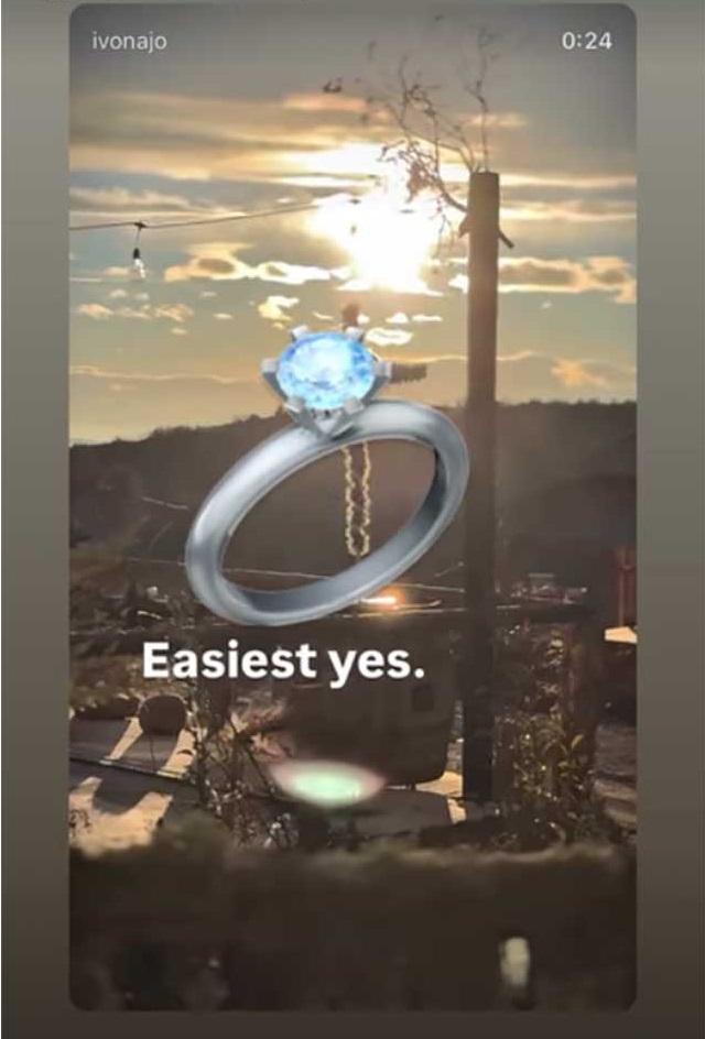 „Најлесното ДА“, напиша Ивона и стави емотикон од дијамантски прстен, а сподели и фотографија направена при запросувањето на која во позадина се гледа знак „Омажи се за мене“.