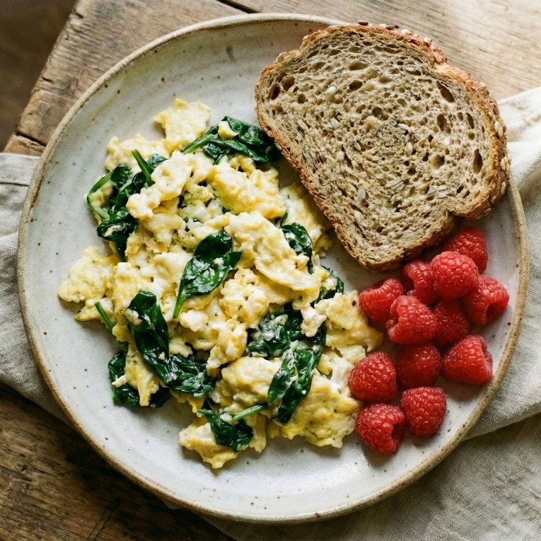 Кајганата со спанаќ, со додаток на малини, го поддржува здравиот крвен притисок уште од раните утрински часови. Јајцата, богати со протеини, помагаат подолго да се чувствувате сити, додека влакната од малините и интегралниот леб придонесуваат за постабилно ниво на шеќер во крвта и подобра контрола на апетитот.