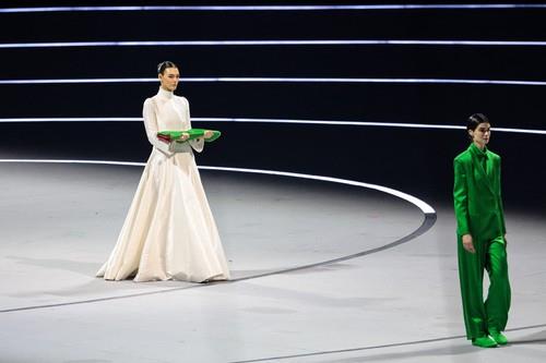 За таа пригода, таа носела долг бел фустан по мерка од „Армани Приве“ со драматични ракави и висока јака. Таа се појавила на крајот од долгата поворка од учесници облечени во бела, црвена и зелена боја, што ги симболизира боите на италијанското знаме.