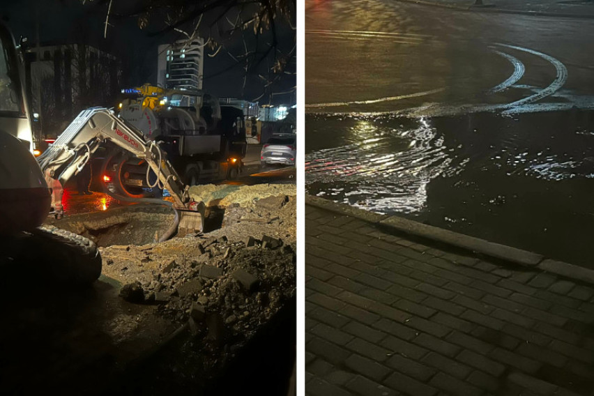 Кај Цветен пазар вечерва е забележан багер и ископана е голема дупка, додека во близина тече вода по коловозот.