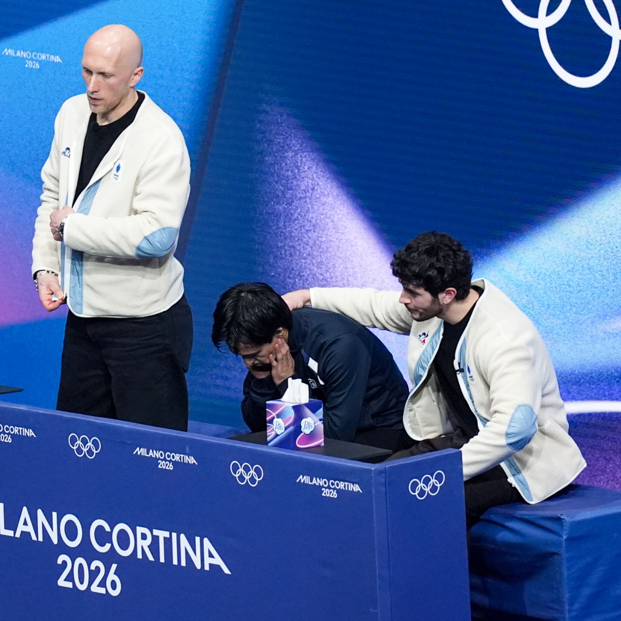 Не е невообичаено повеќе лизгачи да имаа еден тренер, но неверојатно е да се види како ист тренер за секунда ги менува јакните и трча до следниот олимпиец.