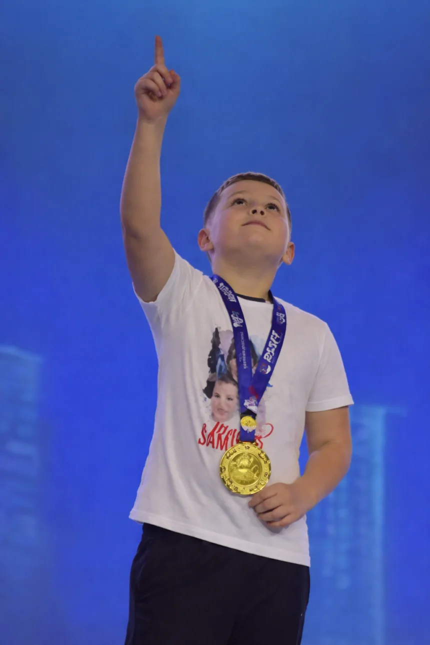 По доделувањето на медалот, момчето го подигна прстот и покажа кон небото, јасно алудирајќи кому му го посветува медалот.