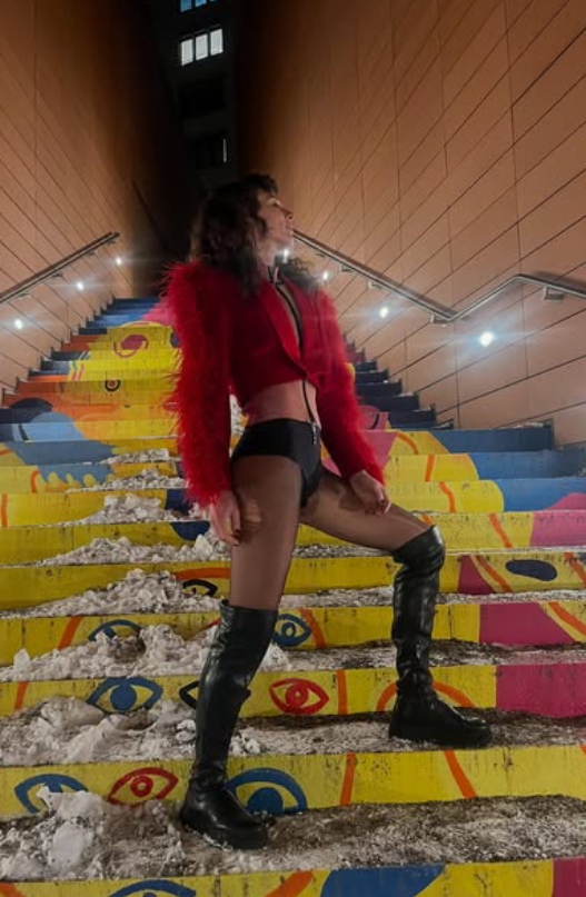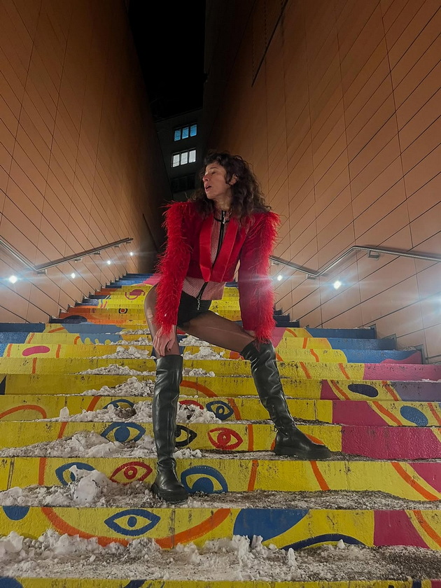 Актерката блеска во смела креација на македонскиот дизајнер Марков – боди со стилизирано црвено палто и високи чизми до над колена, па се чини дека снегот во Берлин не бил пречка таа да прошета облечена во таква креација.