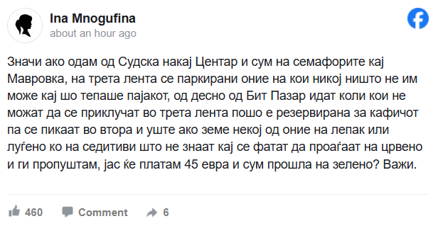 „Значи ако одам од Судска накај Центар и сум на семафорите кај Мавровка, на трета лента се паркирани оние на кои никој ништо не им може кај шо тепаше пајакот, од десно од Бит Пазар идат коли кои не можат да се приклучат во трета лента пошо е резервирана за кафичот па се пикаат во втора и уште ако земе некој од оние на лепак или луѓено ко на седитиви што не знаат кај се фатат да проаѓаат на црвено и ги пропуштам, јас ќе платам 45 евра и сум прошла на зелено? Важи“.