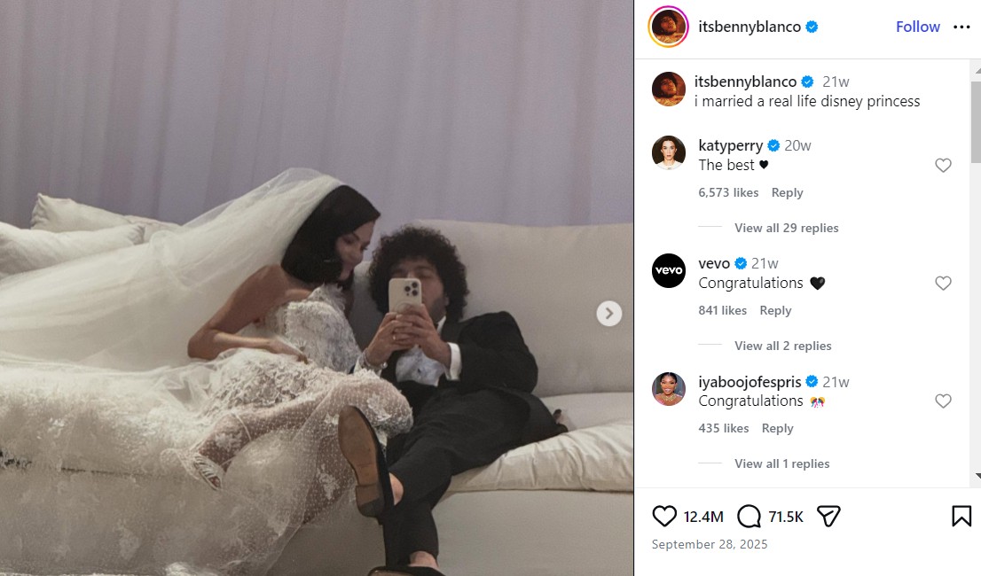 По нешто повеќе од една година врска, во декември 2024 година, пејачката ја објавила среќната вест. „Засекогаш започнува сега“, напишала таа покрај фотографијата од свршеничкиот прстен, на што Бени духовито искоментирал: „Еј, почекај … тоа е мојата жена“.