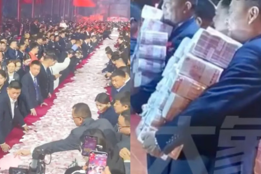 During a Chinese New Year celebration, Henan Kuangshan Crane piled up mountains of cash for 7,000 employees.