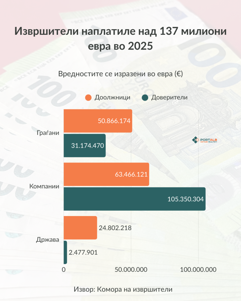 Во 2025 година е наплатен историски највисокиот износ од граѓаните – должници, за првпат надминувајќи 50.000.000 евра. Конкретно, споредбената анализа на податоците што ја направи „Порталб“ покажува дека само за една година, во 2025 г. во однос на 2024 г., присилно наплатената сума е зголемена за речиси 4 милиони евра. Кај компаниите и државата, на годишно ниво има пад на износот на наплатени средства.