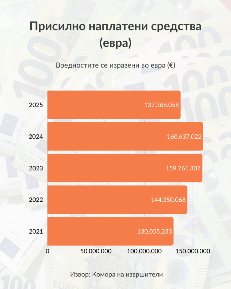 Преку извршители во 2025 година биле присилно наплатени 137.368.058 евра што претставува реализација на 43,63 отсто од примените барања за наплата – покажуваат податоците од новиот Извештај за работата на извршителите во 2025 година. Во однос на 2024 г. присилно наплатената сума е намалена за 23.300.000 евра. Најголем дел од средствата, или скоро 63.500.000 евра се наплатени од „правни лица“, следуваат граѓаните од кои извршителите наплатиле 50.866.200 евра, а на трето место е државата од која присилно се наплатени речиси 24.082.300 евра.