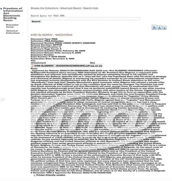Во периодот кога регионот тонел во крвопролевање, Глигоров успеал да маневрира меѓу силните притисоци од Грција, ризикот од Белград и внатрешните етнички тензии со Албанците. Разузнавачките извештаи го опишуваат како „мудар реформатор“ со извонредно внимание кон стратешките детали, пренесува ИНА.