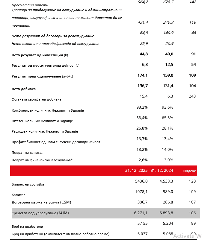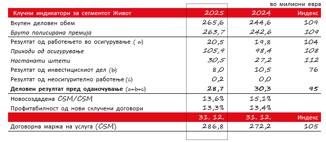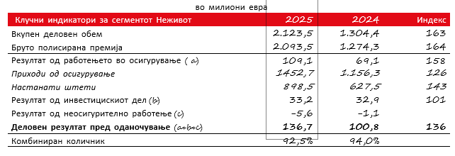 - Комбинираниот количник во сегментите Неживот и Здравје изнесуваше поволни 93,2 проценти (2024: 93,6 проценти), а профитабилноста од нови склучени договори во сегментот Живот изнесуваше 13,3 проценти (2024: 13,4 проценти). Повратот на капитал изнесуваше 13,2 проценти (2024: 14,0 проценти).
