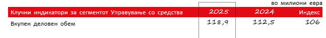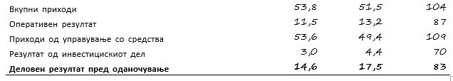 Деловниот резултат пред оданочување изнесуваше 14,6 милиони евра (17 проценти помалку отколку минатата година). Врз тоа влијаеја 9 проценти повисоките приходи од управување со средства (приходи од провизии), кои изнесуваа 53,6 милиони евра. Нето инвестицискиотрезултат, во износ од 3,0 милиони евра, беше за 30 проценти понизок, што главно е резултат на намалувањето на вредноста, односно понизок принос на вложувањата во капитални инструменти од сопствените средства на овој сегмент.