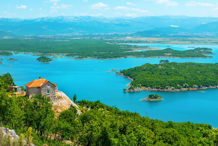 Во неговото синило се расфрлани дури педесетина острови, а некои од нив ги красат стари тврдини и манастири кои ја чуваат богатата историја на овој крај. Вкупната должина на брегот достигнува 168 километри, а езерото го делат две држави – Албанија и Црна Гора. Во рамките на црногорските граници се наоѓаат околу 110 километри брег.