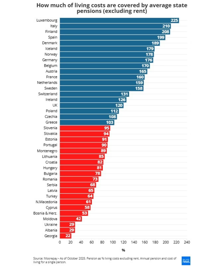Во 39 европски земји — вклучувајќи ги членките на ЕУ, земјите кандидатки, земјите од ЕФТА и Велика Британија — уделот на пензиите во трошоците за живот се движи од 22% во Грузија до 225% во Луксембург.