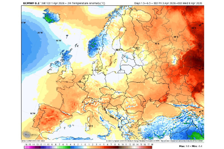 Во втората недела од април, Европа повторно ја очекуваат пониски температури, поттикнати од комбинација на системи со низок притисок и правилно поставено подрачје на висок притисок над северот. Во средината на април прогнозите покажуваат постуден бран, со температури од 5 до 10°C под просекот во поголем дел од континентот. Причината е поделениот атмосферски тек и нискиот притисок над северните делови на Европа. Врнежите ќе бидат над просекот во централна и западна Европа, додека северот ќе биде посув. Во втората половина на месецот потопол воздух ќе се врати на северот од континентот, додека јужниот, централниот и западниот дел од Европа ќе останат малку постудени од просекот.