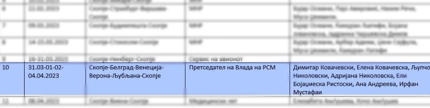 Во државниот авион сопругата ја качил и поранешниот министер за земјоделство и вицепремиер Љупчо Николовски. На службено – приватна турнеја во 2023 година заминале тој и сопругата заедно со тогашниот премиер Ковачевски и сопругата, обезбедувањето на премиерот и уште две вработени во Владата.