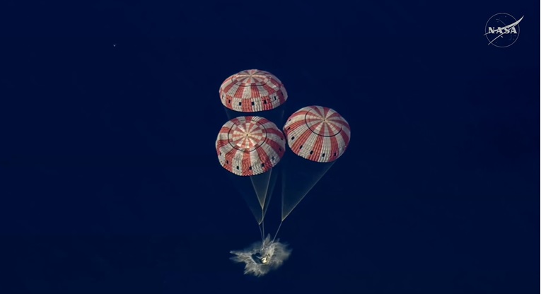 Orion's main parachute has deployed. The spacecraft has a system of 11 chutes that will slow it down from around 300 mph to 20 mph for splashdown.