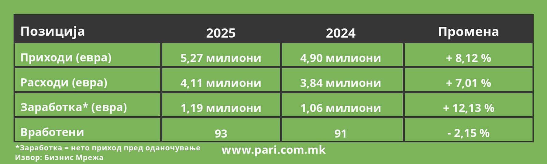 Но, не расте само прометот. Расте и заработката. Нето приходот пред оданочување достигнува речиси 1,2 милиони евра. Компанијата лани обезбедила подобра профитабилност за 12,1 насто во однос на 2024 година. Добивката е солидна ставка во однос на вкупниот промет, што покажува висока бруто-профитна маржа од дури 22,6 насто! Или, во гастрономскиот жаргон, оваа добивка е вистински „чили пипер“ во формирањето на цента на производите.