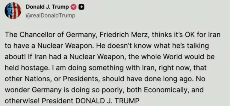 Трамп се огласи на Truth Social, каде што преку објавата тврди дека Мерц смета дека е во ред Иран да има нуклеарно оружје. Германскиот канцелар претходно зборуваше за преговорите меѓу САД и Иран, велејќи дека Иранците се „многу вешти преговарачи“ и дека им дозволиле на Американците да дојдат во Исламабад, а потоа ги оставиле да си заминат со празни раце.